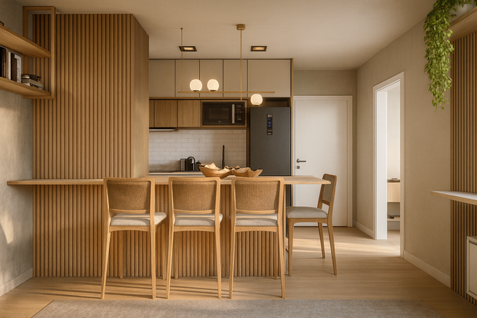 O projeto deste studio foi desenvolvido para explorar ao máximo a integração dos ambientes, unindo sala de estar e cozinha em um layout funcional, aconchegante e elegante. A madeira ripada, presente no painel e nos detalhes do mobiliário, contrasta com a textura sóbria do cimento queimado, criando uma atmosfera que equilibra modernidade e calor visual. O uso de iluminação estratégica — tanto no pendente sobre a bancada quanto nas luminárias de apoio — valoriza cada espaço e reforça a sensação de acolhimento.